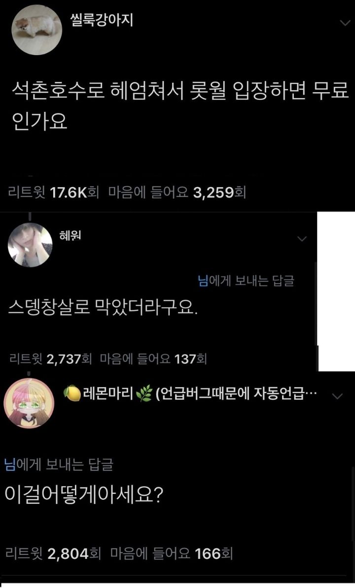 석촌호수로 헤엄쳐서 롯데월드 입장하면 무료인가요?